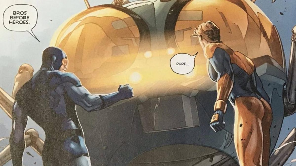 Después de confesarse sus penas, los dos amigos se ponen a llorar y luego empiezan a reir diciendo lo fracasados que son. Blue Beetle le dice a Booster le dice que no pasa nada por cometer errores, que lo que importa es tener buena voluntad, y le pide por favor que le ayude a salvar a sus amigos, Y el segundo acto acaba con Booster y Blue Beetle yendo a la base del imperio a salvar al resto de héroes de tierra 4, pero como pueden ir a la base si han perdido todo?. (Cuando Absoltue Batman llegó a la base de los centinelas de la justicia destrozo todo, incluso la nave y los discos de reggaetón de blue beetle, ups, Spoilers 👿🐇).